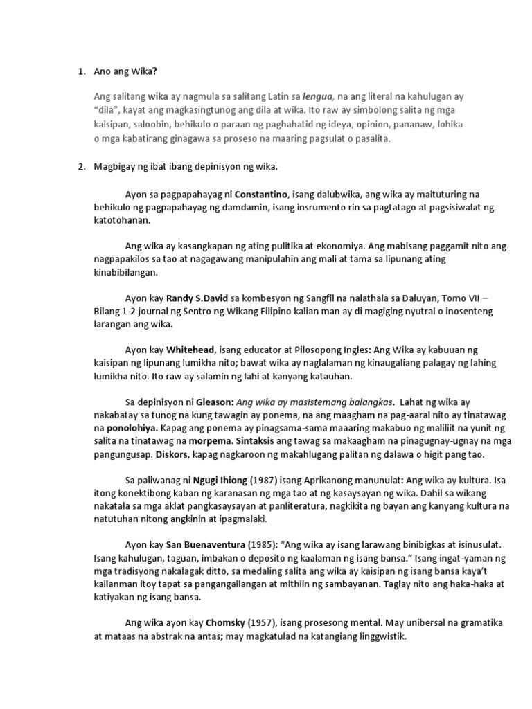 Binigyang kahulugan ni Henry Gleason ang wika bilang isang balangkas na masistema ng mga tunog na binibigkas at inayos sa arbitraryong pamamaraan para makabuo ng mga titik na pagsasama-samahin upang makagawa ng isang salita na maaaring gamitin sa pagpapahayag ng damdamin o saloobin. Pagiging natatangi ng mga salitang Griyego lalo na sa mga pangngalang pantago 3. Ayon kay Webster1974536ang wika ay isang sistema ng komunikasyon sa pagitan ng mga tao sa pamamagitan ng mga pasulat o pasalitang simbulo.