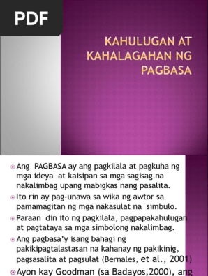 Ayon kay Badayos ang pagsulat at isang mahirap na kakayahan. Ang pagbasay isang bahagi ng pakikipagtalastasan na kahanay ng pakikinig pagsasalita at pagsulat Bernales et al. Ang pagbasay isang bahagi ng pakikipagtalastasan na kahanay ng pakikinig pagsasalita at pagsulat Bernales et al 2001 Ayon kay Goodman sa Badayos2000 ang pagbasa ay isang psycholinguistic guessing game.
