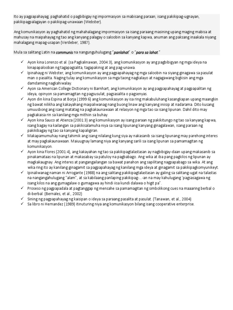 1990 2 Ayon kina Sauco at Atienza 20013 ang komunikasyon ay isang paraan ng pakikitungo ng tao sa kanyang kapwa isang bagay na kailangan sa pakikisalamuha niya sa isang lipunang kanyang ginagalawan isang paraan. Sa Bernales et al 2006. Ayon kina Paz et.